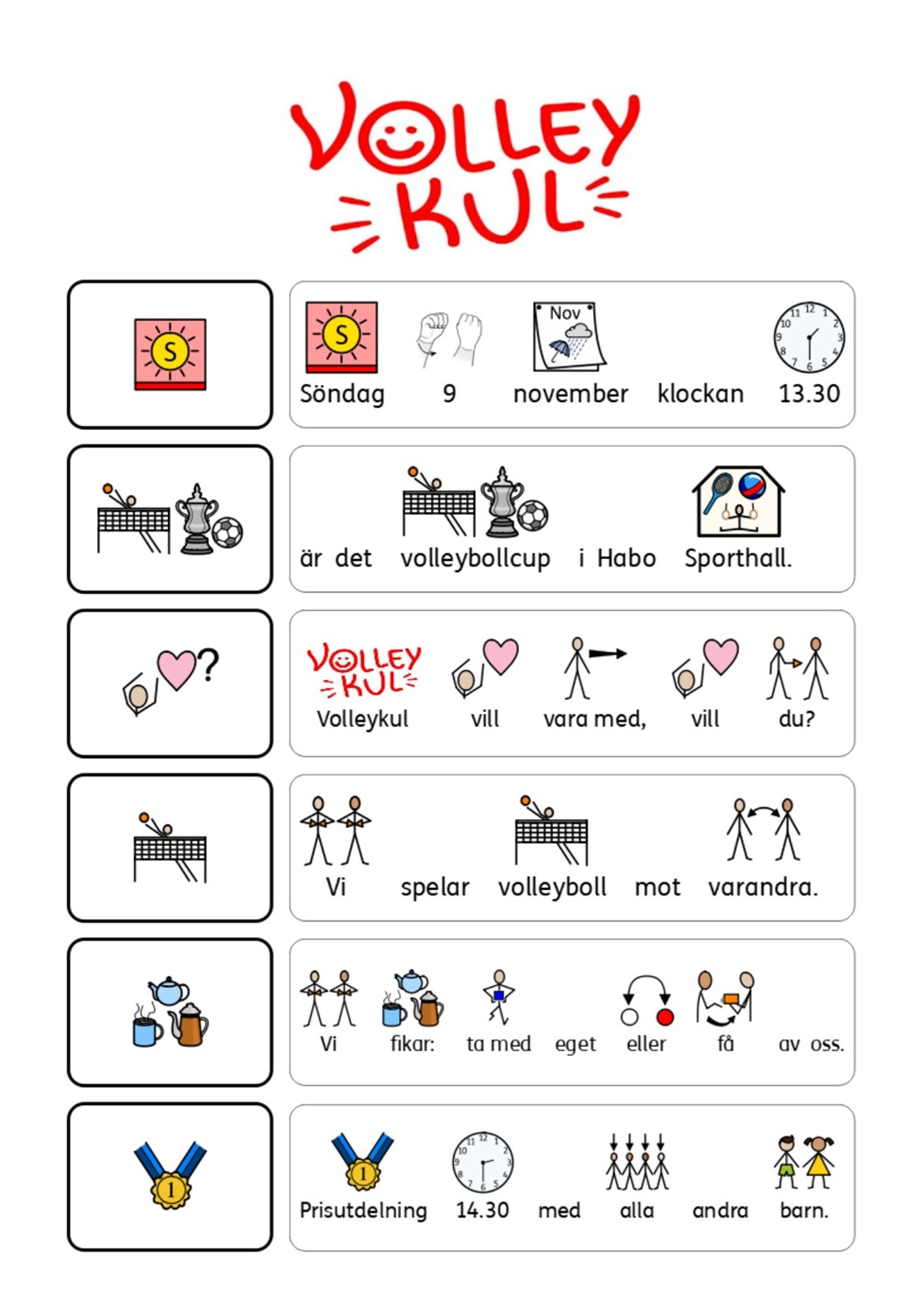 Träningarna innehåller hinderbana, kasta och fånga ballong/volleyboll, dansstop, volleyboll-memory och enklare spel/lek över volleybollnät. Vi jobbar med ett tydligt bildschema och träningarna kommer se någorlunda lika ut för att skapa en trygghet för barnen.